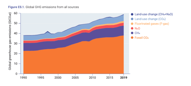Medregnet utslipp knyttet til arealbruksendringer, var de globale utslippene i 2019 på 59,1 GtCO₂e. Det er rekordhøyt og en økning for tredje år på rad.