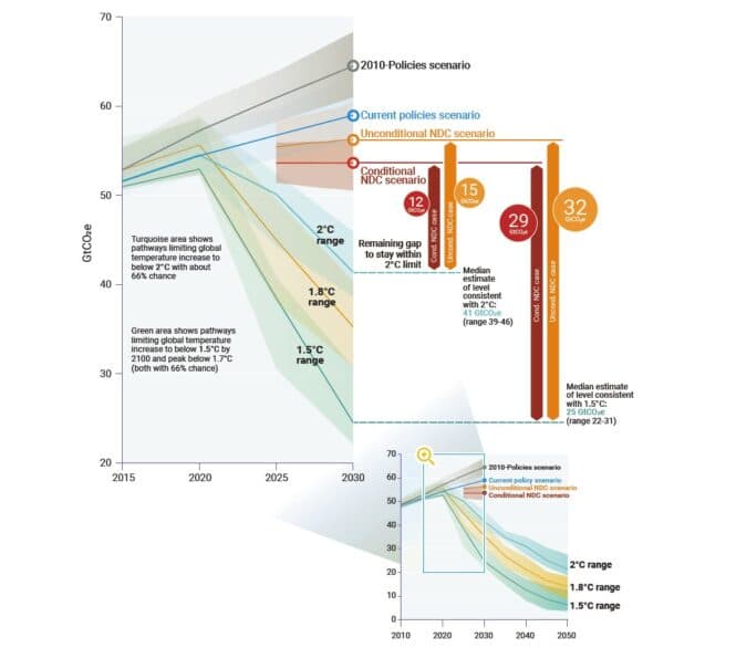 Hvert år ser man i «Emissions Gap Report» på de forventede utslippene i 2030 og hvordan de vil påvirke globale temperaturendringer.