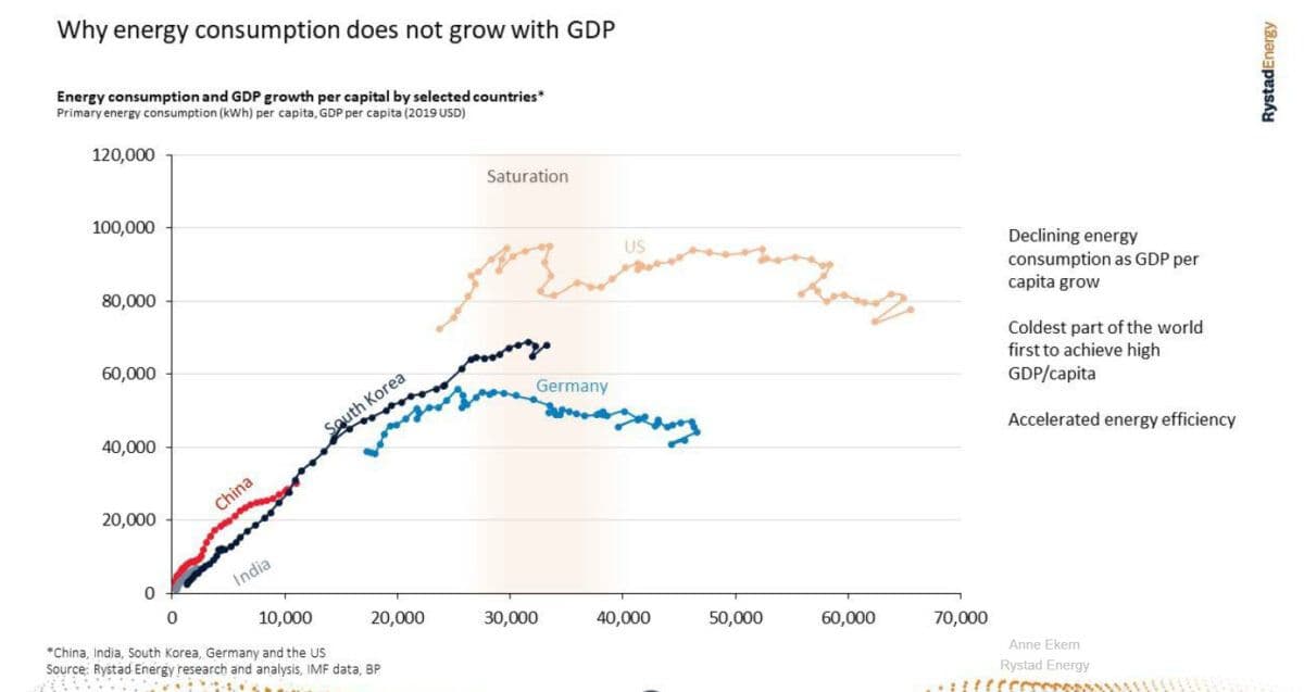 – Her tar mange feil i analysene av energifremtiden. De forventer at energiforbruk vil vokse i takt med bnp fremover, men det vil det ikke, sier Rystad.