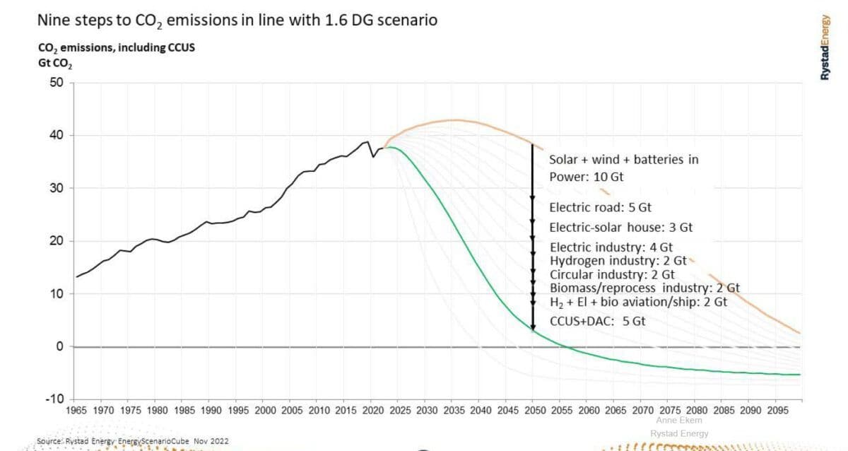 Et blikk på CO₂-scenarioet for 1,6 grader viser hva Rystad Energy mener skal til for å klare de reduksjonene i utslipp som trengs mellom nå og 2050, sammenlignet med et scenario for 2,5 grader (se figur). I 2050 dreier det seg om en forskjell i utslipp på 35 milliarder tonn (Gt) CO₂.