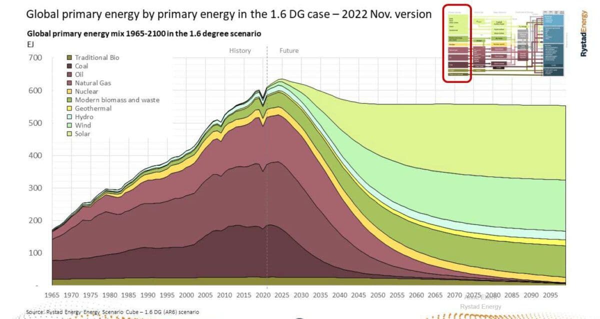 I scenarioet for 1,6 grader skjer nettopp denne storstilte utbyggingen, og dermed blir det store bildet på den globale energimiksen seende slik ut: