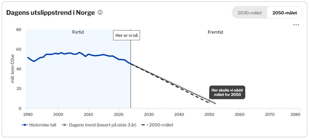 De siste tre årene er Norges klimagassutslipp redusert med 1,4 millioner tonn per år. Fortsetter denne trenden fremover, kan Norge nå klimamålet for 2050 i 2052. Dette er en forbedring på 15 år, sammenliknet med trendbanen Norge lå på før utslippstallene for 2024 ble publisert.