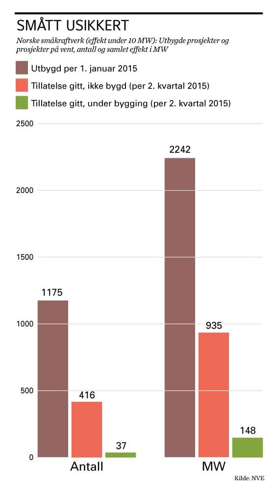 Boomen i utbygging av norsk småkraft – vannkraftverk under 10 MW installert effekt – har bråstoppet. I begynnelsen av 2015 fantes det 1175 kraftverk (se figur lenger ned i saken). Ytterligere 416 prosjekter var godkjent av myndighetene, men eierne hadde satt utbyggingen på vent. Hovedårsaken er at lave kraftpriser truer lønnsomheten i småkraftverkene.