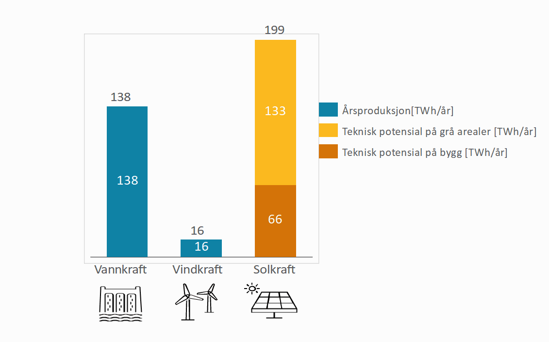 Men hvor stort er det teoretiske, tekniske potensialet for solkraft? Det har Multiconsult beregnet i en rapport som Solenergiklyngen nylig publiserte. Konsulentselskapet kommer til at produksjonspotensialet er større enn dagens samlede produksjon av vann- og vindkraft.