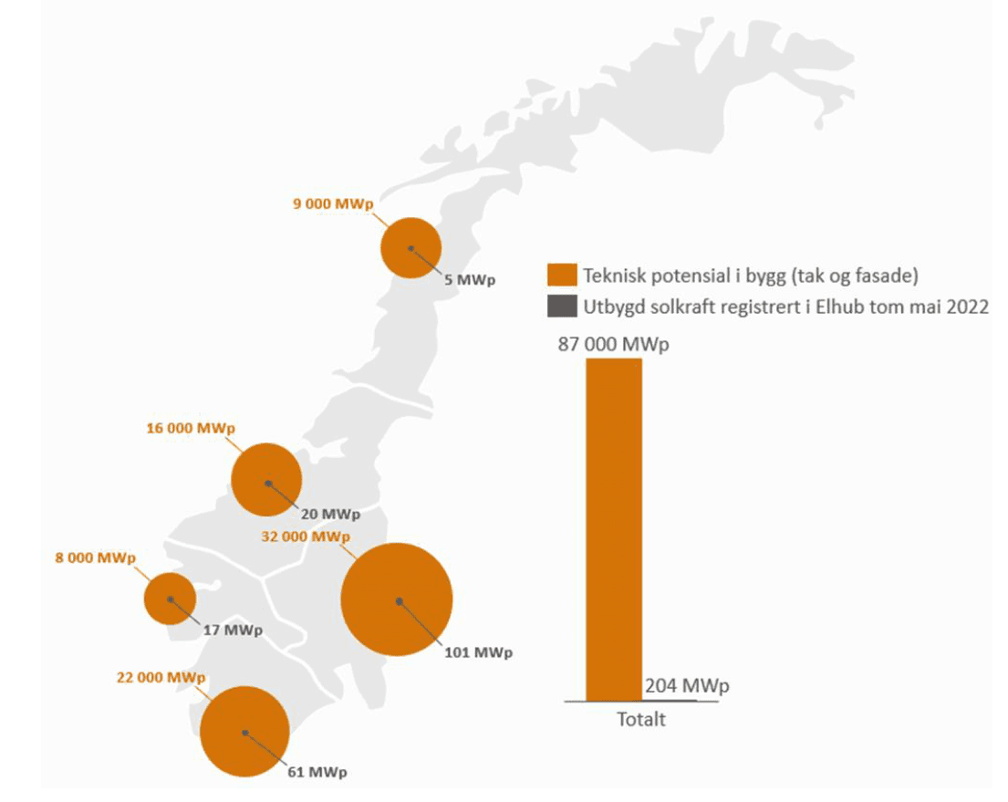 Det tekniske potensialet på bygg alene – tak og fasade – er på 87000 MW.