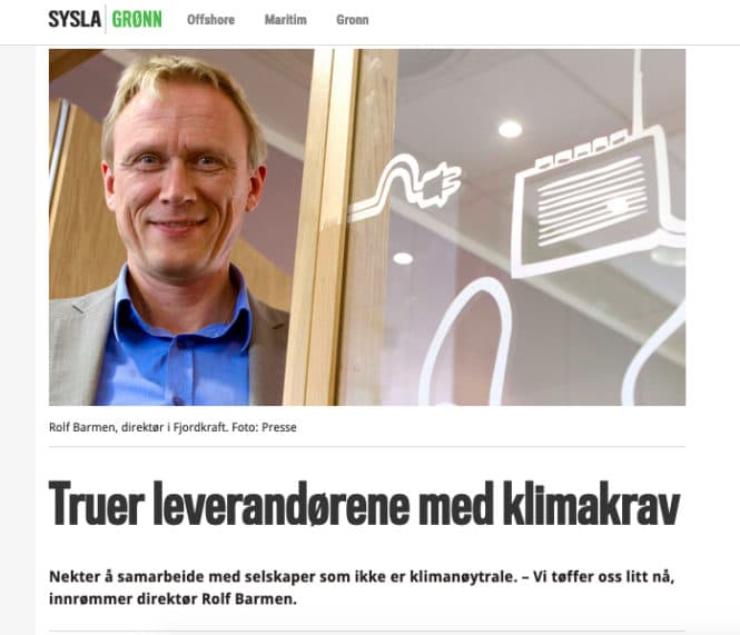 STILLER KRAV: Fjordkraft har fått mye oppmerksomhet det siste året for Klimanjaro –et initiativ som går ut på å stille absolutte klimakrav til leverandørene sine. De som ikke aksepterer kravene vil bli erstattet. Foto: Faksimile Sysla Grønn