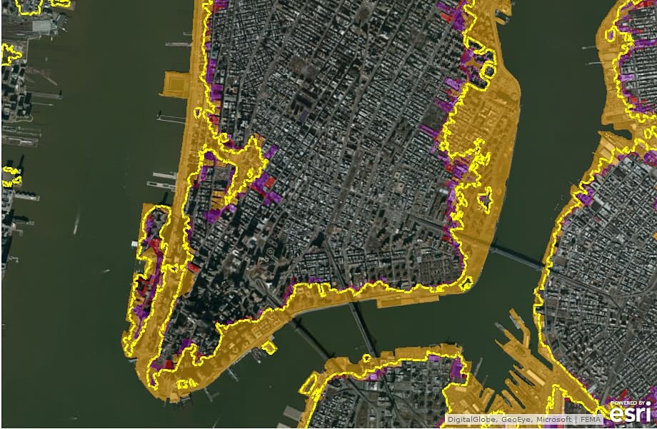 Flomutsatte områder på nedre Manhattan. (foto: Sea Level Rise Planning Tool – New York City).
