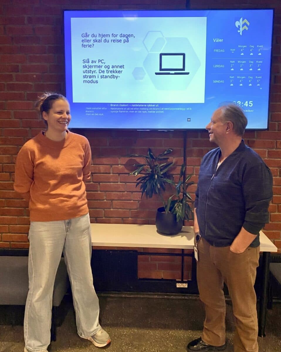 Når ansatte og innbyggere kommer inn i Våler Herredshus, blir de servert folkeopplysning om en hel del energisparetiltak fra en skjerm der lysarkene går i loop foran skranken ved hovedinngangen. Avdelingsleder Marita Ask og kommunalsjef Bent Melleby i Våler kommune mener det er mye strøm å spare på at flere blir mer bevisste. (Foto: Anne Jortveit)