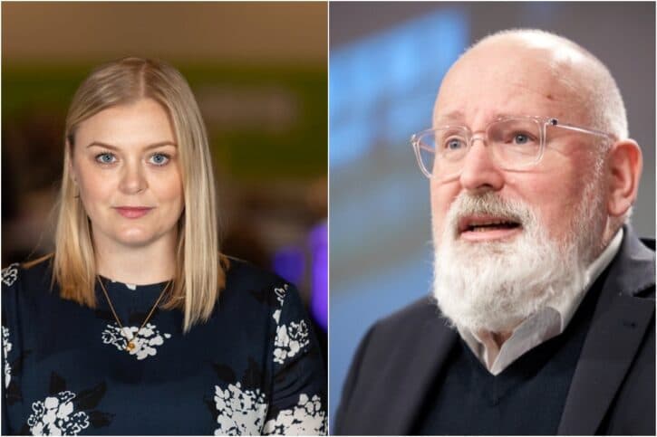 Olje- og energiminister Tina Bru ber EU-kommissær Frans Timmermans om endringer i vurderingen av vannkraft som investeringsobjekt. (Foto Bru: Hans K. Thorbjørnsen, Høyre. CC: by-nd-nc. Timmermans: Claudio Centonze, EC Audiovisual Service)