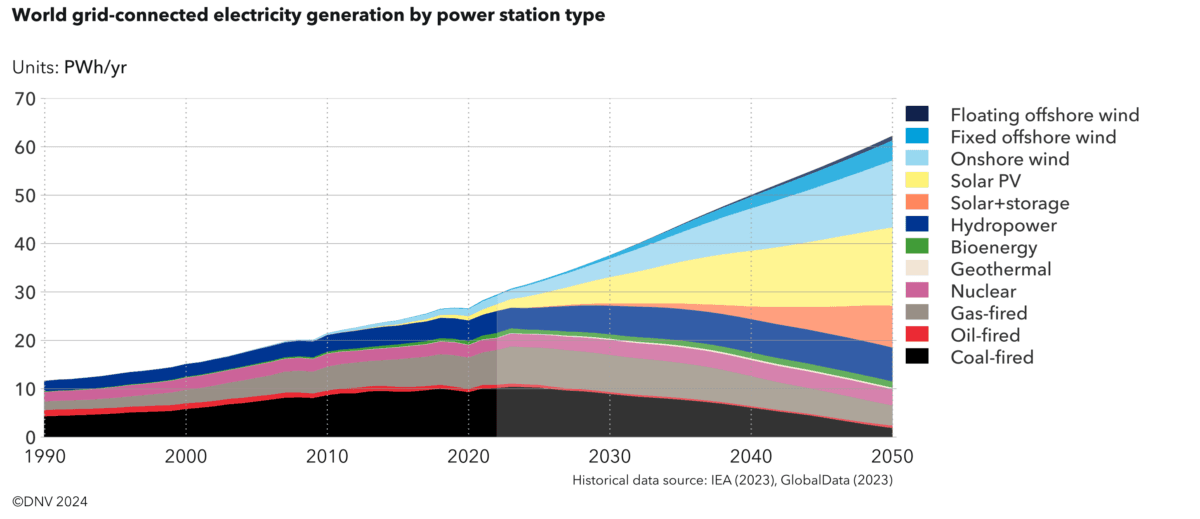 DNV forventer at verdens etterspørsel etter elektrisitet vil dobles innen 2050. Mesteparten av strømmen vil komme fra sol og vind, og sammen med annen fornybar kraft og atomkraft, vil nesten 90 prosent av elektrisiteten være fossilfri.