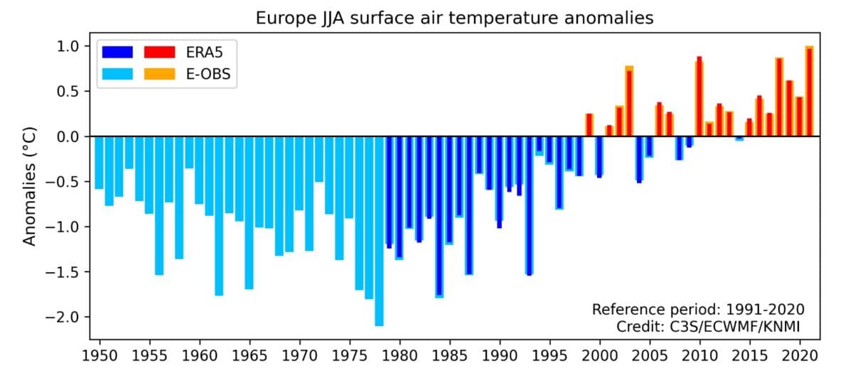 I samtalen kommer vi inn på en grafisk fremstilling av somrene i Europa fra 1950 til 2021. Grafen viser hvordan somrene har blitt varmere de siste tiårene. Du kan lese mer om datagrunnlaget her: The Copernicus Climate Change Service.