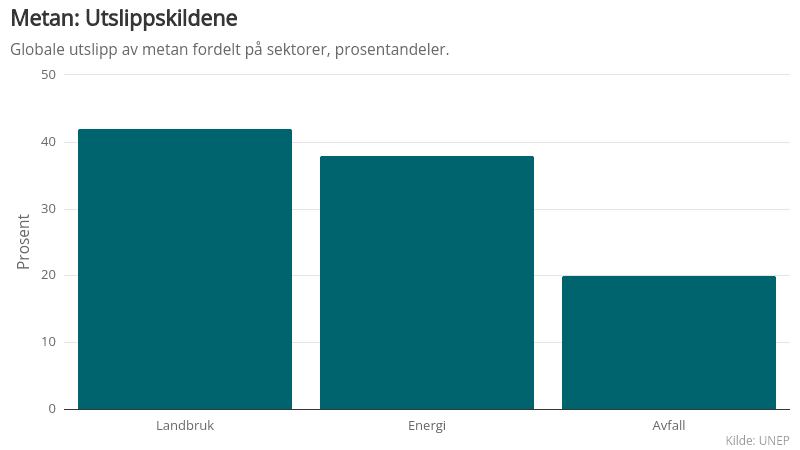 Data18. november 2025Ser fremskritt på metan-kuttMetan-utslipp står for nær en tredel av global oppvarming. Landenes planer kan gi 8 prosent kutt innen 2030, men potensialet er mye større, ifølge FN-rapport.