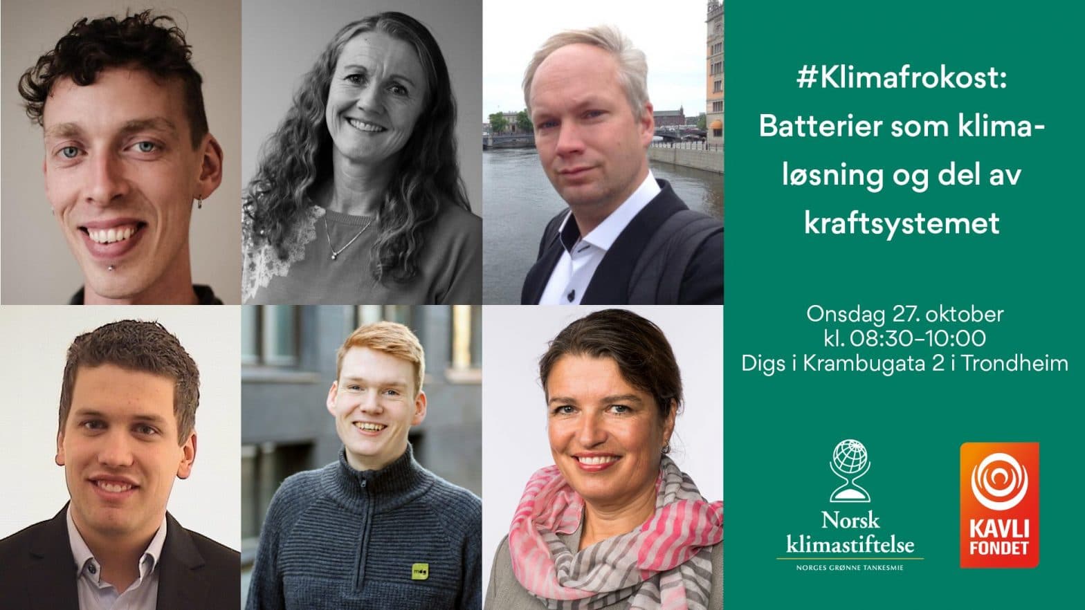 Nyhet25. oktober 2021Se opptak: #Klimafrokost om batterier som klimaløsning og del av kraftsystemet27. oktober arrangerte Norsk klimastiftelse #Klimafrokost i Trondheim om hvordan stadig rimeligere batterier kan brukes til å fase ut fossil strøm. Se opptak her.