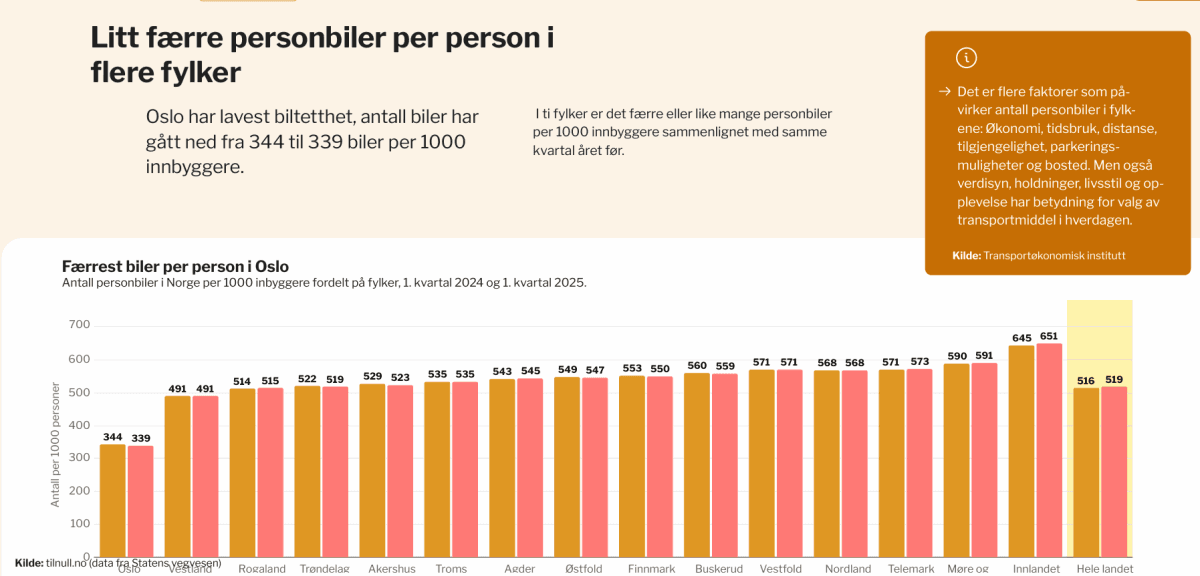 Data28. august 2025Innlandet er Norges klart mest biltette fylkeBiltettheten går ned i seks av landets 15 fylker, mens den fortsatt øker i tre – og mest i Innlandet. Det er nå dobbelt så mange biler per 1000 innbyggere i Innlandet som i Oslo.