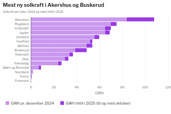 Hittil i år har estimert årlig solkraftproduksjon i Norge økt med 70 GWh. Halvparten av veksten er kommet i Akershus og Buskerud.