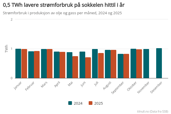 Data14. november 20250,5 TWh lavere strømforbruk på sokkelenHittil i år har 8,97 TWh strøm gått til produksjon av olje og gass i Norge. Det er 0,5 TWh mindre enn på samme tid i fjor.