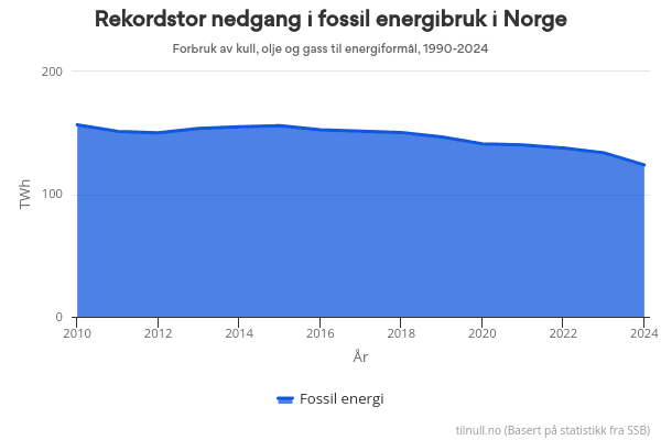 Data10. september 2025Rekordstor nedgang i fossil energibrukNorges fossile energibruk har falt hvert år siden 2015. Farten i nedgangen tiltok i 2024.