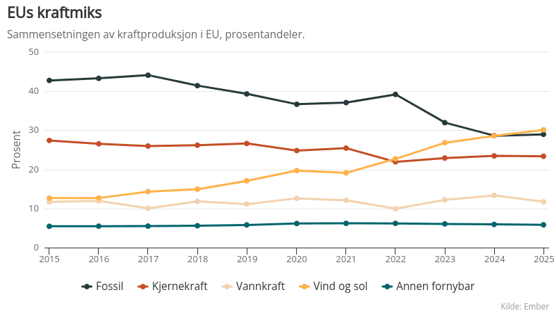 Data22. januar 2026Vind og sol større enn fossilt i EUVind- og solkraft sto for 30 prosent av strømproduksjonen i EU i 2025, og var for første gang større enn fossil kraft.