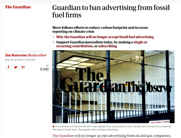 Fem på fredag31. januar 2020The Guardian svartelister annonser fra olje- og gasselskaperUK-avis boikotter petro-annonser grunnet oljeindustriens aktive motarbeidelse av nødvendig klimapolitikk. Svensk Stål blir utslippsfri ti år før planen og Exxon Mobil-aksjen på sitt laveste på ti år etter gigainvesteringer i nye fossilprosjekt.