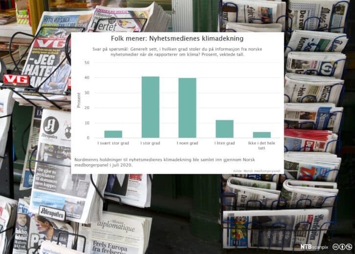 Nyhet1. september 2020Tillit til mediedekning om klimaDe fleste nordmenn stoler i stor grad eller noen grad på nyhetsmedienes klimadekning. Den yngste aldersgruppen har klart høyest tillit til klimarapporteringen i mediene.