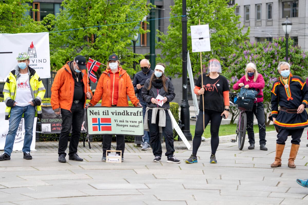 Demonstranter mot vindkraft på Øyfjellet utenfor Stortinget.