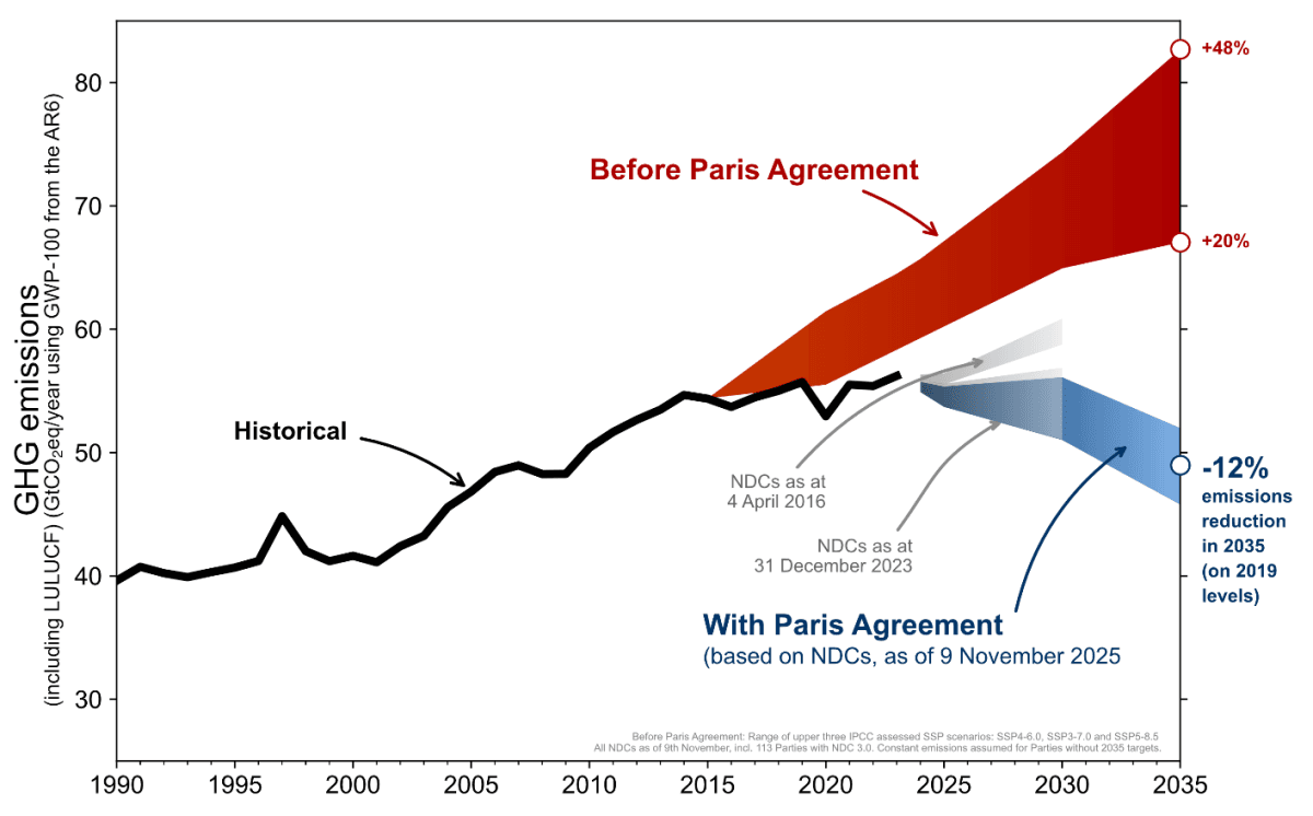 Data11. november 2025Landenes klimamål gir marginal fremgang på utslippskuttBasert på klimamål landene har levert under Parisavtalen, vil globale klimagassutslipp være 12 prosent lavere i 2035 enn i 2019. Målet om å begrense global oppvarming til 1,5 °C krever 60 prosent kutt.