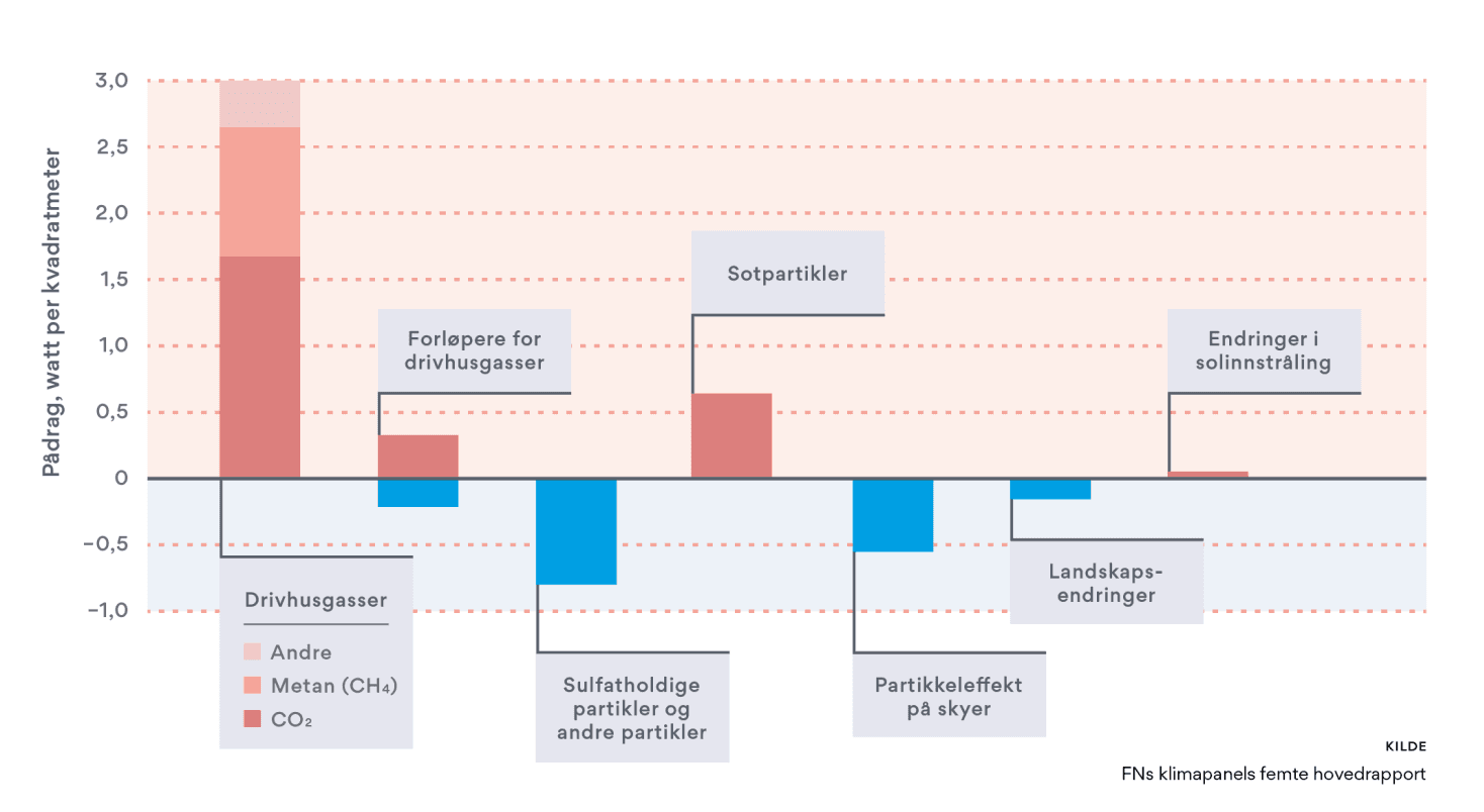 Solen stråler altså ikke vesentlig sterkere enn for 100 år siden. Og selv om andre faktorer bidrar til pådraget, er CO2 viktigst. Bidragene fra de andre blekner i forhold – noen av dem kan til og med motvirke effekten av CO2.