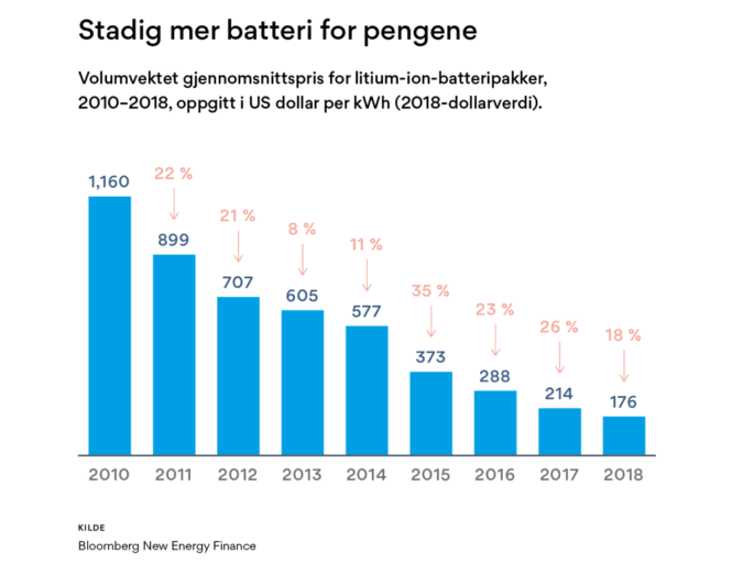 Kostnadene for batteriene har gått ned med over 80 prosent fra 2010 til 2018. I tillegg har kvaliteten blitt bedre og levetiden lengre, sier Svensson.