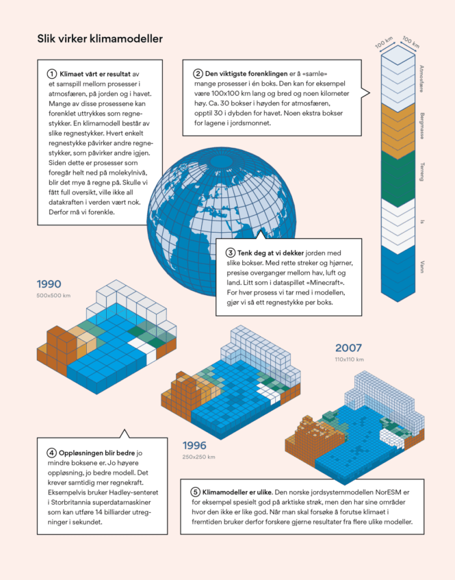 Klimamodellene forbedres hele tiden. Fordi klimaforskere forstår mer av hva som bidrar til å styre klimaet, men også ettersom regnekraften i datamaskiner blir bedre. Jo flere regneoperasjoner en datamaskin kan gjøre i sekundet, jo mer detaljert kan man lage klimamodellene, og jo mer detaljert og nøyaktig informasjon kan modellene gi oss.