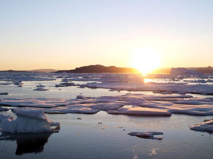 Solen går ned over Sermilik-fjorden på Øst-Grønland. Når sjøisen forsvinner fra arktiske strøk, går oppvarmingen raskere.