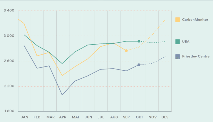 2020 måned for måned: Globale utslipp av CO₂ fra fossil energi per måned i 2020, i millioner tonn (Mt), anslag fra tre analysemiljøer. Stiplet linje er foreløpige anslag for november og desember. Ulike datakilder er brukt for å beregne utslipp, som: Kraftforbruk, annet energiforbruk, veitrafikk, flybevegelser, mobilitetsdata fra bl.a. Google, TomTom, FlightRadar24.