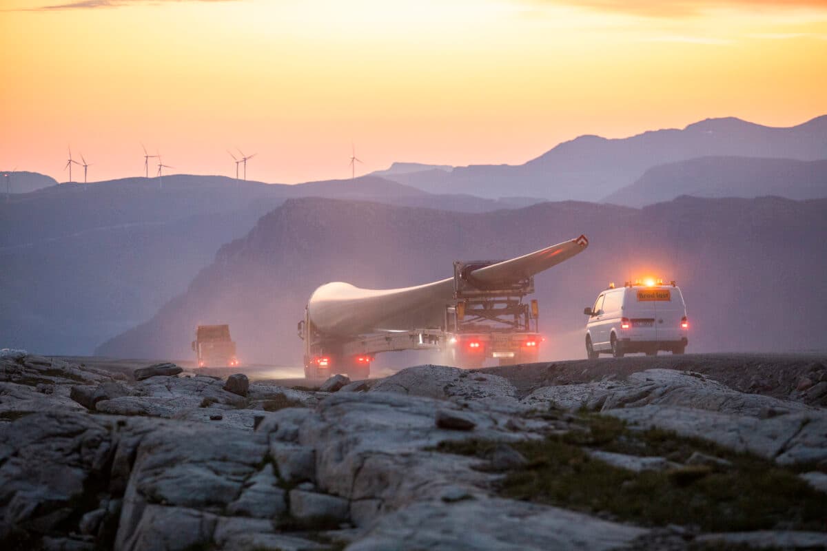En 70 meter lang vinge på vei opp til Guleslettene vindpark like ved Florø, som sto klar i 2021. Totalt er det installert 47 turbiner. Hvert tårn er 90 meter høyt. Total høyde blir da 158 meter.
