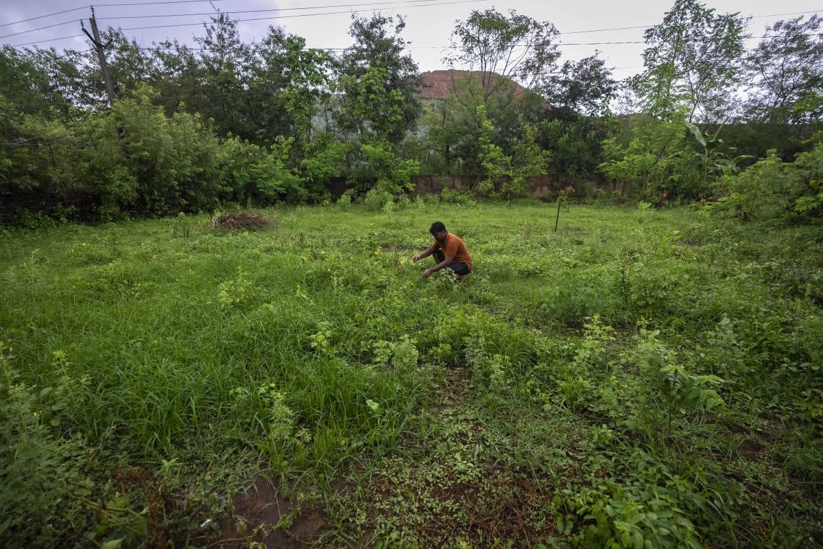 En bonde jobber på marken sin i Jajapur-distriktet i den indiske delstaten Odisha. På grunn av kromgruven som kan skimtes i bakgrunnen har han ikke klart å dyrke noe som helst nyttig. Foto: Anupam Nath / AP Photo / NTB