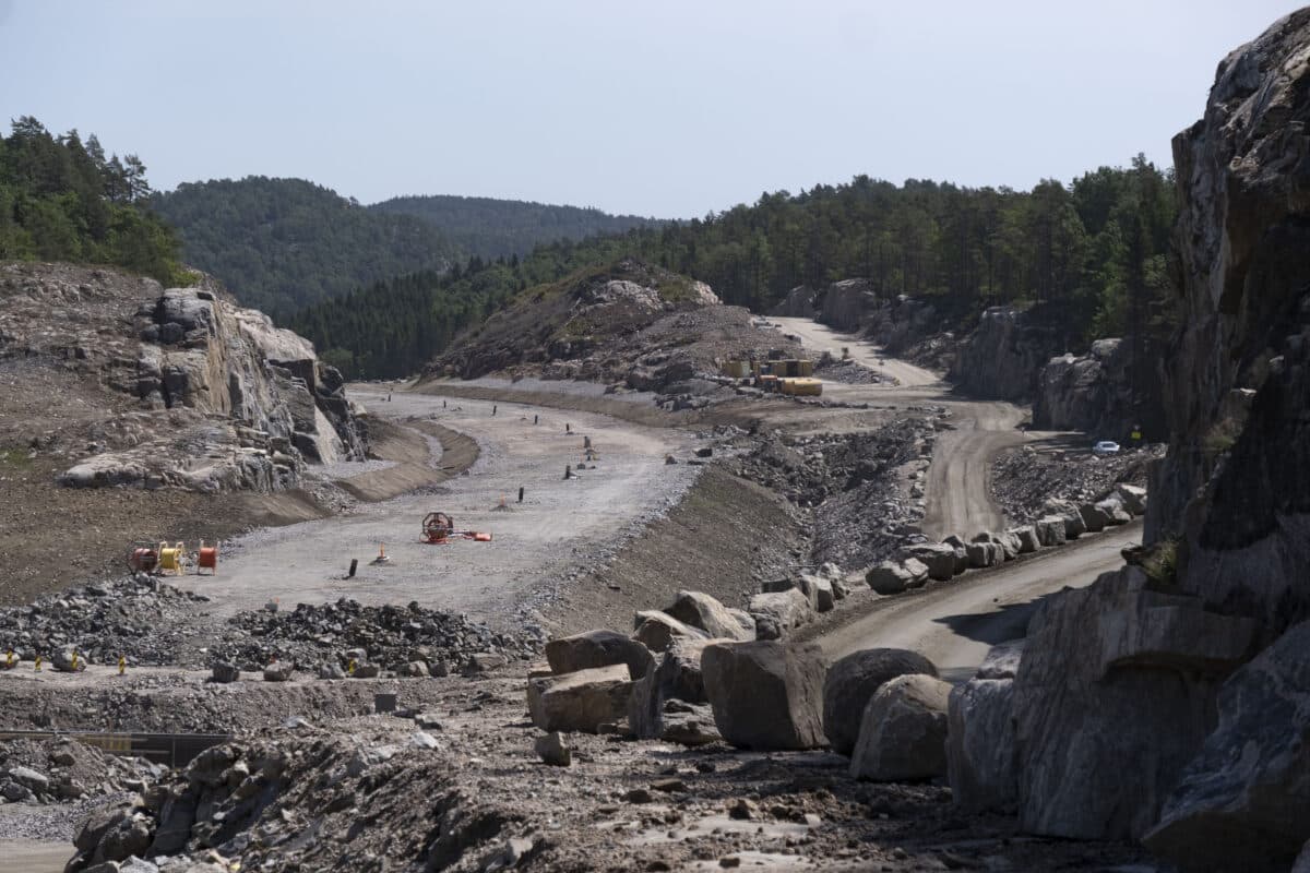 Fra byggingen av ny E39 mellom Kristiansand og Mandal øst. Dette skal bli en 25 meter bred firefelts motorvei med fartsgrense på 110 km/t. Foto: Tor Erik Schrøder / NTB