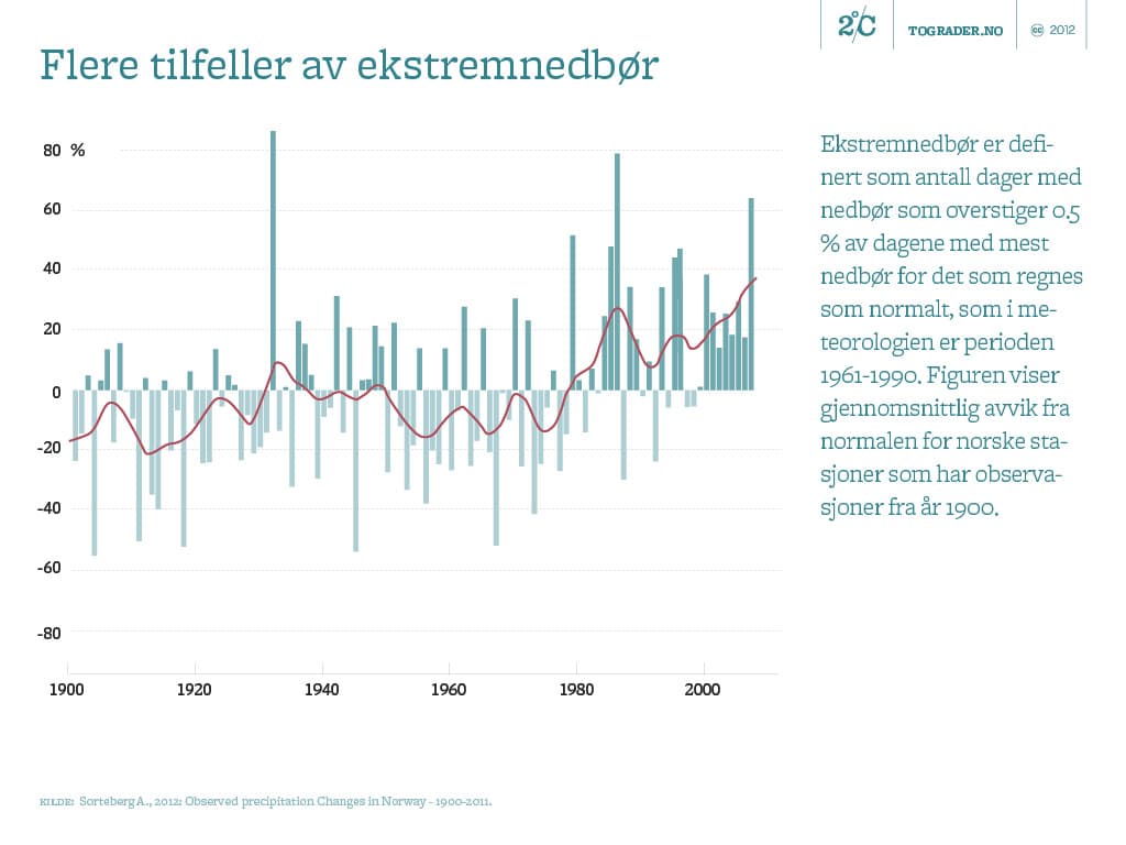 Langtidstrenden i gjennomsnittlig årlig nedbør viser en økning på 21 prosent fra 1900 fram til 2011. Vi ser en økning over hele landet og på 96 prosent av stasjonene som har observasjoner som dekker hele perioden. Selv om økningen i prosent er relativt lik over hele landet betyr dette at i antall millimeter er det Vestlandet som har fått den største økningen der mange av stasjonene har en økning på over 0,5 meter i løpet av perioden. Så lenge vi har observasjoner har det aldri regnet mer enn i 2011 som var 31 prosent over 1961-1990 normalen.