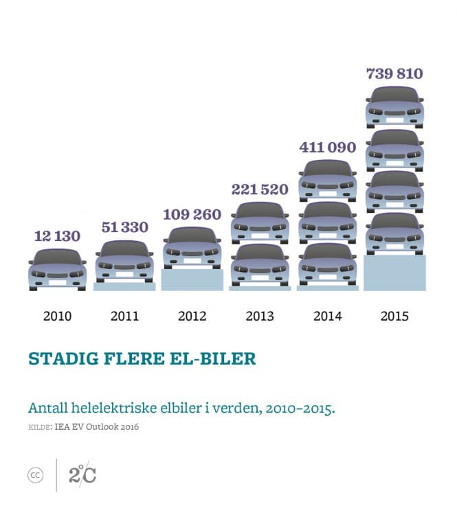 Mens Tyskland var tidlig ute med å støtte produksjon av solcellestrøm, og med det bidro til økte produksjonsvolum og reduserte kostnader som resten av verden fikk nyte godt av, er det Kina som presser opp etterspørselen etter elbiler på verdensbasis. Fra 2014 til 2015 økte den kinesiske elbilbeholdningen med over 180 prosent. Kinas elbilsatsing handler ikke først og fremst om klima, men om å bekjempe luftforurensing og bidra til industriell vekst. Ikke bare er Kina landet som kjøper flest elbiler, de produserer også flest elektriske kjøretøy. I London kjører det nå batteridrevne «black cabs» og røde dobbeltdekkere produsert av kinesiske BYD – verdens største elbil-produsent.