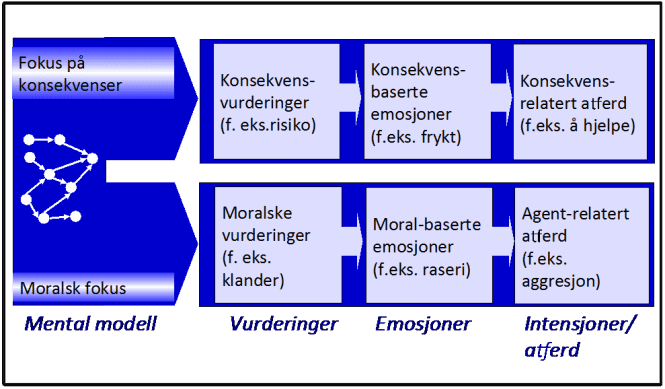 Begge disse innebærer spesifikke kognitive vurderinger, emosjoner og atferdsmessige impulser. Konsekvensvurderinger fører til risikorelaterte kognisjoner (f.eks. anslått alvorlighetsgrad og sannsynlighet for ulike konsekvenser), emosjoner som oppstår som følge av forventede eller opplevde konsekvenser (f.eks. frykt eller tristhet), og atferd som har til hensikt å forhindre eller lindre skadevirkninger.