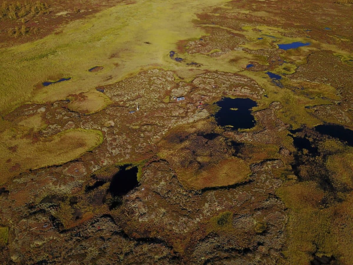 Oversiktsfoto tatt med drone av palsfeltet omtalt i artikkelen, nær Iškoras-fjellet i Finnmark. (Foto: Sebastian Westermann, Universitetet i Oslo)
