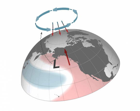 Modellstudien viste at det varme Stillehavet påvirket temperaturen i Arktis på to måter. For det første er lavtrykket nord i Stillehavet, ved Aleutene, sterkere i perioder med varmt havvann. Med et sterkere lavtrykk transporteres mer varm luft fra lengre sør i Stillehavet nordover og inn i Arktis.